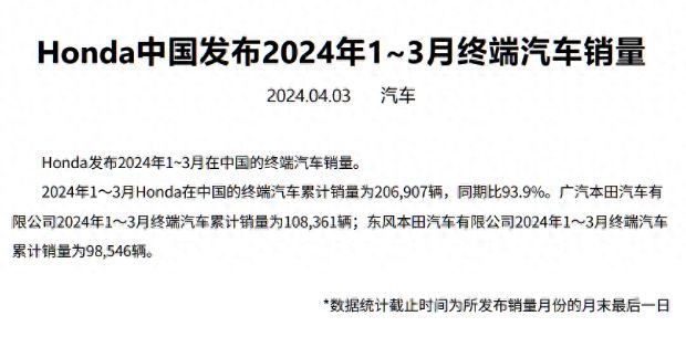 东风本田1-3月累计终端销量98546辆,与去年同期的102,441辆相比,下跌3.8%。其中,3月份销量为30331辆,同比减少24.6%。