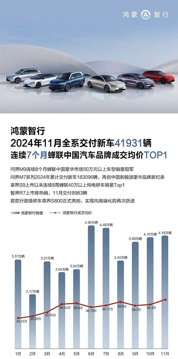 华为鸿蒙智行日前宣布,11月鸿蒙智行全系交付新车41931辆,连续两个月突破4万辆,其中问界M9发布11个月累计大定突破18万辆,连续蝉联中国市场50万以上月度销冠。问界M7系列11月交付12573辆,2024年累计交付新车183096辆,上市13个月累计交付新车23万辆。智界R7 11月交付8983辆。享界S9上市以来连续蝉联40万以上纯电轿车销量第一。尊界S800上市48小时预定2108台。
