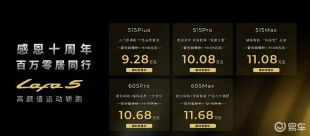 11月27日,零跑汽车全新战略车型Lafa5正式上市,包含五款车型,官方指导价区间9.78-12.18万元;限时权益价区间9.28-11.68万元。Lafa5基于LEAP 3.5架构B平台打造,CLTC纯电续航里程分别为515km和605km。高性能Ultra版计划2026年上半年交付。
