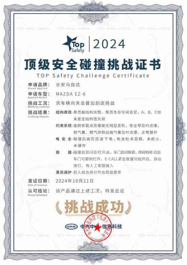 值得一提的是,EZ-60是行业首个在丙察察完成“整车对撞、翻滚、浸水”三连极限挑战的新能源SUV,拿下TOP Safety顶级安全认证。在极端工况下,车辆车身依然完整,车门可正常打开,电池包无火、无爆、无烟,所有安全系统全部正常响应,用实战验证了EZ-60的安全实力。